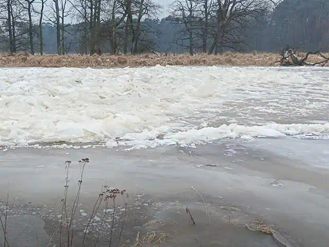 Zatory lodowe mogą lokalnie podnosić poziom wody i wpływać na brzegi oraz koryto rzeki, szczególnie w węższych odcinkach. Na razie nie ma informacji o zagrożeniu w regionie.