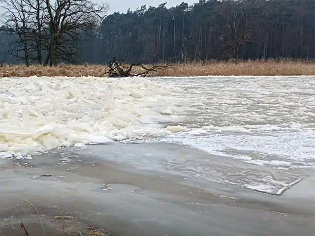 Przesuwający się zator lodowy na Warcie między Radzewicami a Trzykolnymi Młynami – kadr z nagrania opublikowanego przez Koło PZW 117 Rogalin.